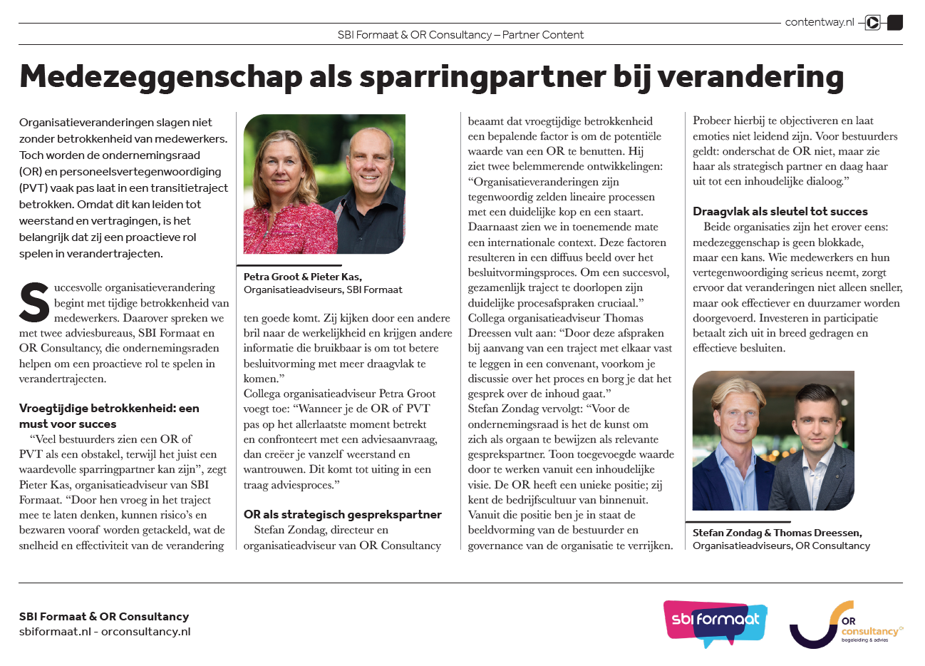 Eind februari stond een gezamenlijk artikel van SBI Formaat met partner OR Consultancy prominent in de verdiepingsuitgave Persoonlijke Groei van Het Financieele Dagblad (FD). Het FD interviewde organisatieadviseurs Petra Groot en Pieter Kas en de collega’s Stefan Zondag en Thomas Dreessen van OR Consultancy over het belang van de betrokkenheid van de OR bij organisatieverandering.