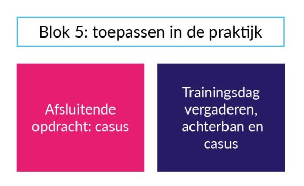 Het leertraject bestaat uit een combinatie van opdrachten, trainingen en e-learning. Hieronder zie je de opbouw van het leertraject.
