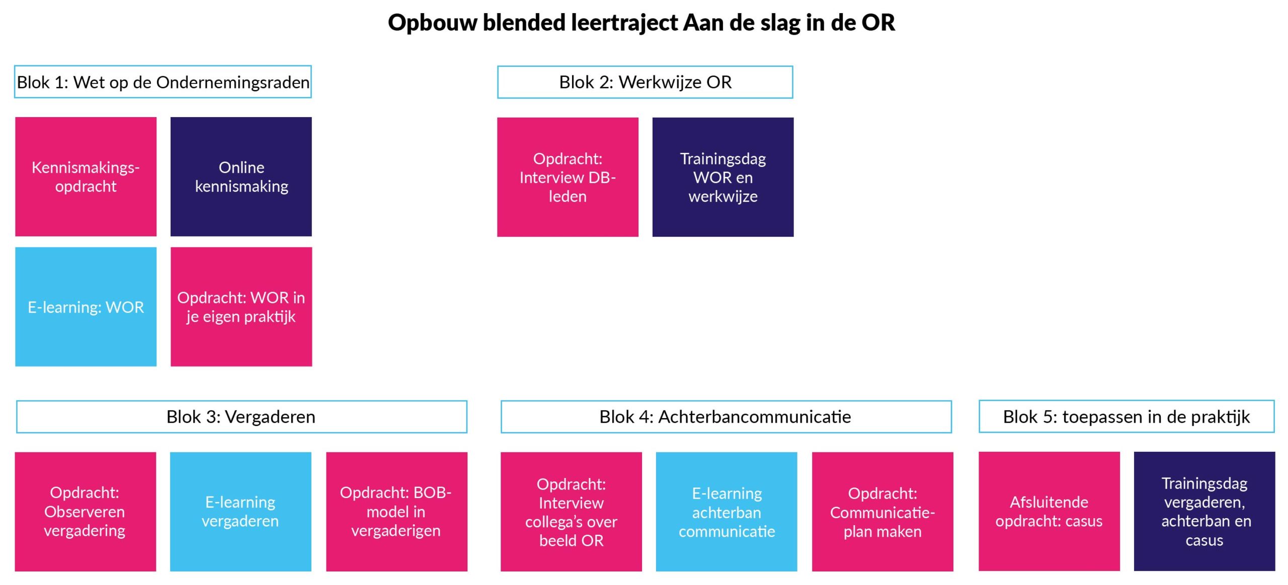 Het OR-werk is ook niet zomaar iets. Het vraagt zoveel kennis en vaardigheden dat je daar een goede basis voor nodig hebt. Dit alles is niet in één of twee dagen te leren, vandaar dat wij een blended traject hebben ontwikkeld waarin jij in een paar maanden uitgroeit tot een OR-lid vol kennis, vaardigheden en zelfvertrouwen.